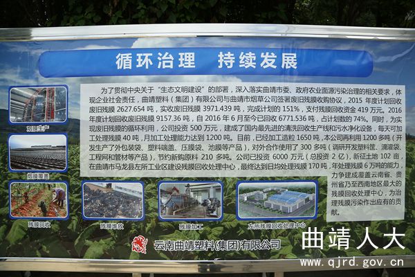 据了解,早在2015年,曲靖塑料集团有限公司就与曲靖烟草公司签署了残膜收购协议,投资500余万元建成省内首家技术最先进的大田农膜回收生产线及污水、污泥处理系统。回收、清洗、晾晒、撕碎、上料、拉丝、切粒、包装,经过以上一系列综合加工利用流程后,此前残留在田间地头的“视觉污染”物即变成了值钱的“宝贝”,后期还可生产线管、菜筐以及建筑用的塑料盒等深加工产品。2016年8月,因原厂区位置受限,曲靖塑料集团有限公司正式租用中轻依兰股份集团有限公司马龙分公司厂区建设残膜回收加工中心。该中心占地40亩,计划投资3000万元,拟建成年收购残膜30000吨,回收颗粒20000吨的残膜回收加工处理中心。截至目前,已投资1000万元,建成回收清洗生产线2条,回收造粒生产线3条,加工能力为年回收残膜15000吨,颗粒7000吨。该产业的形成,有效解决了旱作农业废弃地膜处置难、面源污染大的难题,产生了良好的经济、社会和生态效益。
